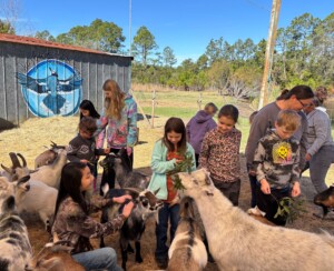 Wild Oak Explorers is based at Jaybird Hammock Farm, 45 minutes north of Jacksonville. Most of the property is wooded and home to wild animals endemic to North Florida. But there’s also a menagerie of farm animals, including chickens, turkeys, ducks, two donkeys, one mule (a diva named Buttercup) and at least 15 friendly goats.