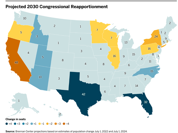 The Brennan Center has released projections of congressional reapportionment following the 2030 Census. The Brennan Center projects Florida and Texas to be the big winners, with each state gaining four (!) congressional seats. Arizona, Idaho, North Carolina, and Utah each gaining one seat in the projections. California loses four (!) seats, with New York losing two seats, Illinois, Minnesota, Oregon, Pennsylvania, Rhode Island and Wisconsin project to lose one seat each.
