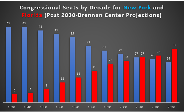 It is not terribly difficult to discern the trends here, what with New York having nine times as many congressional seats as Florida in 1930 but projected to have eight seats fewer than Florida after 2030. As recently as 2000-2010, New York still held a 29 to 25 congressional seat advantage, and the states stood tied at 27 each for the 2010-2020 period. If the Brennan projections prove out, Florida will have gained five seats since the 2010 Census, while New York will have lost three.